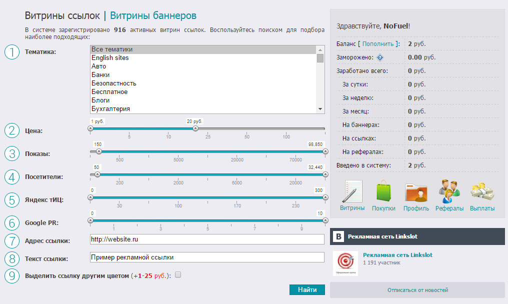 8 Текст ссылки. Информация, введенная в это поле в значительной мере влияет на количество найденных площадок. У каждой витрины в системе есть ограничение по вводимым символам в пределах одной рекламной строки. После заполнения поля система автоматически рассчитает длинну текста ссылки и будет подбирать только те витрины, где ваш текст вместится полностью. Не используйте слишком длинные фразы, рекомендуемая длинна текста ссылки от 20 до 40 символов.